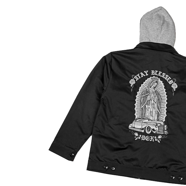 Jaqueta trucker Dgk importada, feita em 100% sarja de algodão-poliéster durável, a jaqueta DGK Lo-Side tem um capuz acoplado e um fecho de correr completo. Nas costas possuí uma grande imagem da Virgem Maria cuidadosamente bordada, enquanto as letras DGK adicionais podem ser encontradas no peito. Com um forro interior listrado e uma gola dobrada clássica.